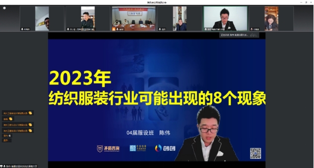 随后,杭州矛盾文化创意有限公司创始人,我校04级校友陈伟结合相关数据、事实依据,就2023年纺织服装行业发展可能出现的8个现象分享了自己对纺织服装产业未来的看法。
