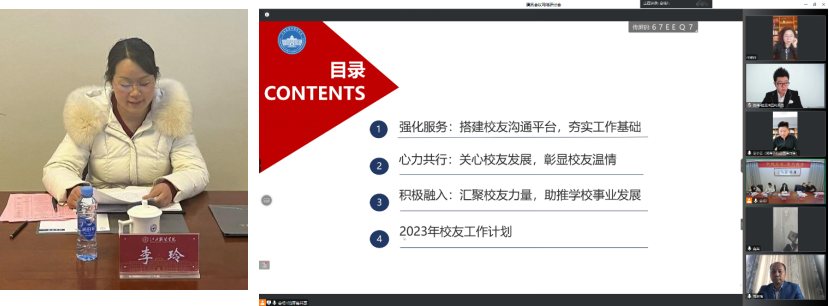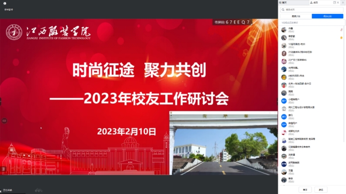 新闻中心讯(校友服务中心供稿)为促进校友与母校之间、校友与校友之间的情感联系,共同探索校友会建设方向,凝聚起校友力量,助力学校教育事业和校友事业发展。2月10日下午,学校组织召开“2023年校友工作研讨会”。学校副理事长、校友总会会长涂燕萍出席会议,就业处(校友服务中心)副处长李玲、鲍仁成及校友服务中心工作人员,校党委宣传部、学工处、创业学院等职能部门负责人、各二级学院党总支书记和部分荣退老教师代表参加会议。来自广东、浙江、江苏、福建、江西、上海、北京、四川、河南、山西、西安、新疆等百余名校友代表相聚云端,共话江服心,共诉江服情。会议由校党委副书记唐新强主持。