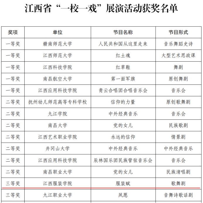 新闻中心讯  1月12日,江西省教育厅公布江西省“一校一戏”展演活动获奖名单。我校歌舞剧《服装赋》荣获三等奖。