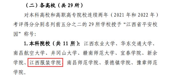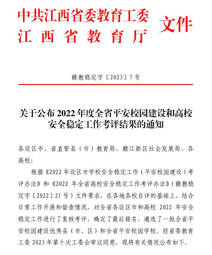 新闻中心讯(万强)近日,省委教育工委、省教育厅印发《关于公布2022年度全省平安校园建设和高校安全稳定工作考评结果的通知》,我校在2022年度考评中获得本科组第十二名,被全省通报表扬,并被授予“江西省平安校园”荣誉称号,成为全省唯一获此殊荣的民办本科高校。