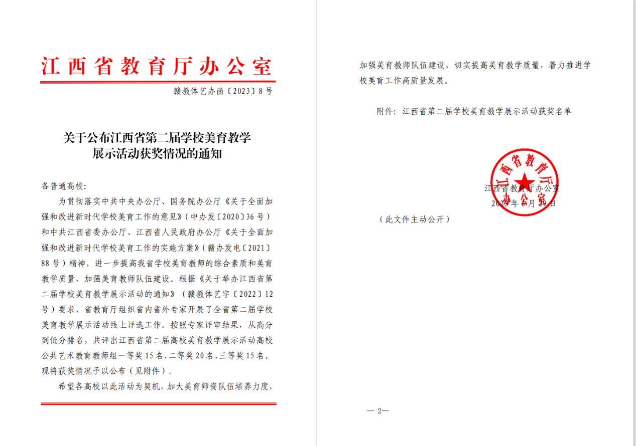 据悉,本次活动由江西省教育厅主办,旨在进一步提高学校美育教师的综合素质和美育教学质量,加强美育教师队伍建设,按照专家评审结果,共评出一等奖15名,二等奖20名,三等奖15名。