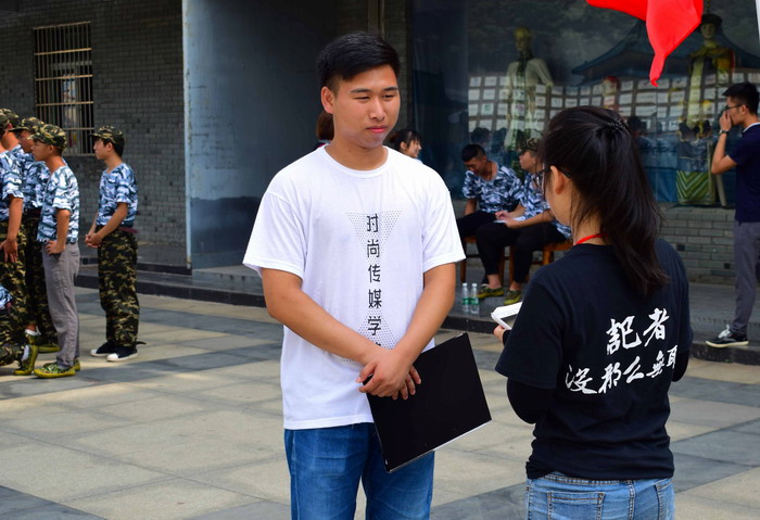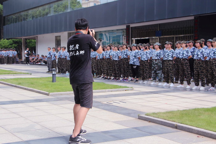 黑色。在军训场上有一群“黑衣人”,他们头顶着骄阳,有的手中拿着笔和纸,有的挂着相机,有的扛着摄影机穿梭在军训场地的各个角落,只为记录军训中最美的一刻。他们就是校园记者,身穿黑色的社服,不辞辛苦,不惧骄阳,军训的每一天都可以在军训场上看见他们。一日之际在于晨,每一天工作之前要开一个早会,早会结束后记者们各自去完成任务。工作结束后,开一个总结会,互相总结这一天的工作,没有抱怨,只有努力,因为他们知道自己身上的担子不轻,赋予他们的责任让他们义不容辞。