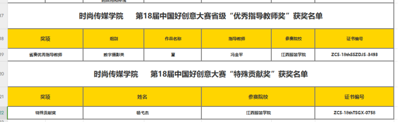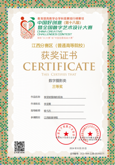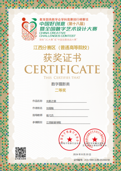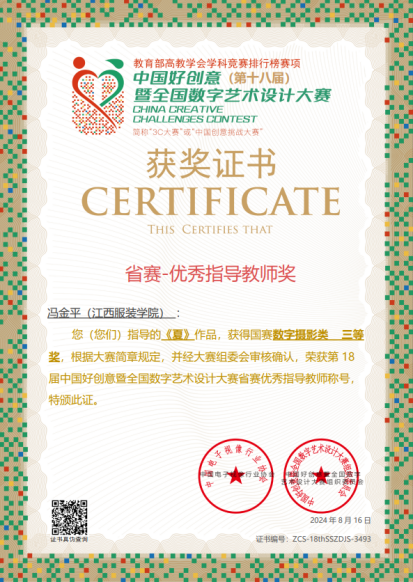 时尚传媒学院讯 近日,由中国电子视像行业协会主办的第18届中国好创意暨全国数字艺术设计大赛圆满落幕。万象城平台时尚传媒学院的学生在大赛中获得全国赛三等奖1项、江西省赛二等奖2项、三等奖5项、优秀奖5项,同时,时尚传媒学院的冯金平老师荣获优秀指导教师奖,杨弋杰老师荣获特殊贡献奖。