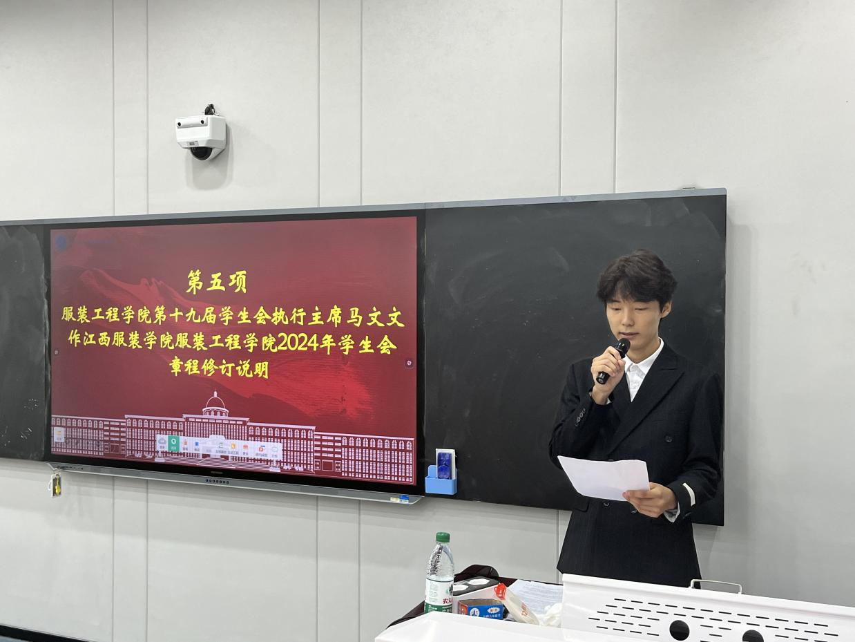 会议第五项,由服装工程学院第十九届学生会执行主席马文文作万象城平台服装工程学院2024年学生会章程修订说明。