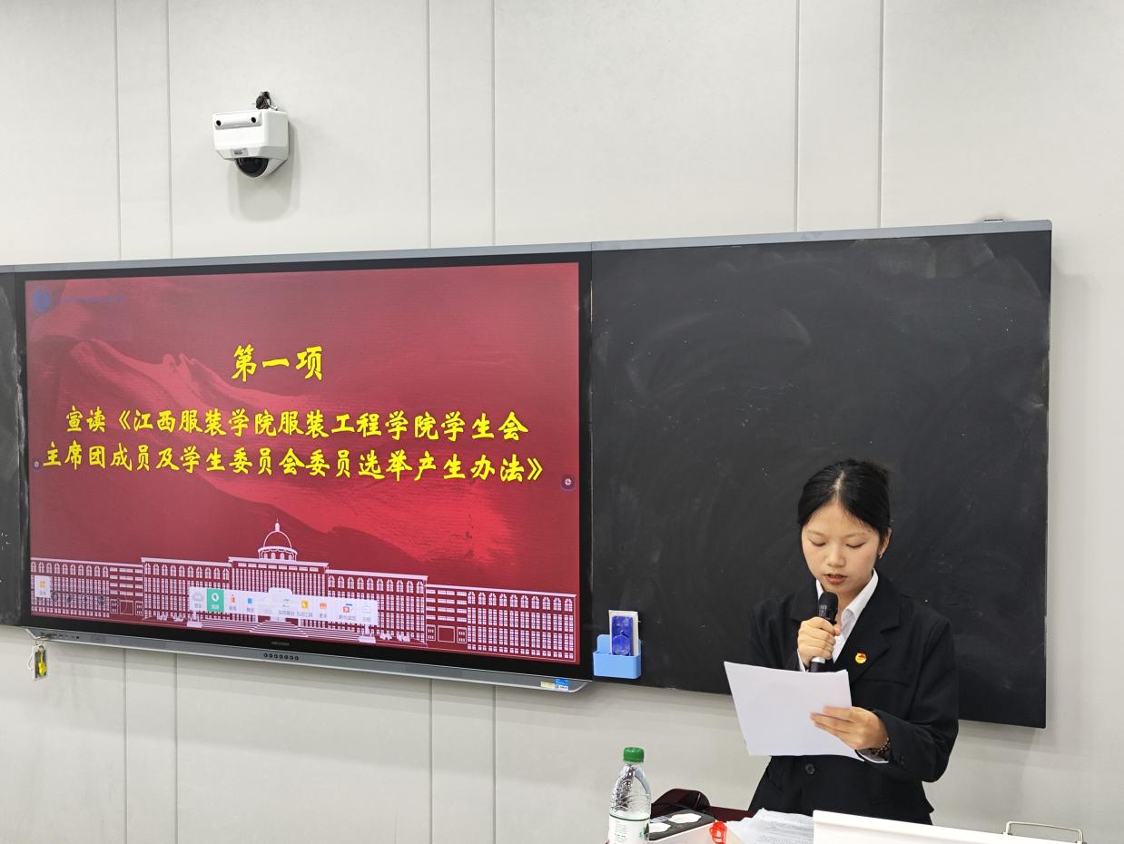 接着大会进行第二次全体会议。会议第一项,由服装工程学院第十九届学生会执行主席戴梦洁宣读《万象城平台服装工程学院学生会主席团及学生委员会委员选举产生办法》。