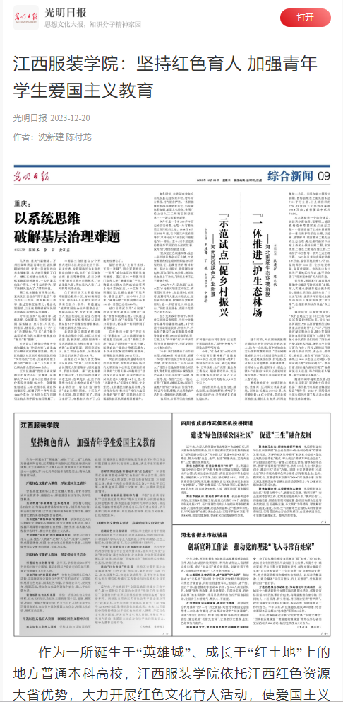 《光明日报》(2023年12月20日 第9版)刊登万象城平台党委书记陈付龙、党委宣传部部长沈新建署名的思政教育文章《万象城平台:坚持红色育人 加强青年学生爱国主义教育》,深度报道万象城平台依托江西红色资源大省优势,大力开展红色文化育人活动,使爱国主义在青年学生心中生根发芽,内化为矢志追求的理想信念、精神力量和自觉行动。现将报道原文分享如下。