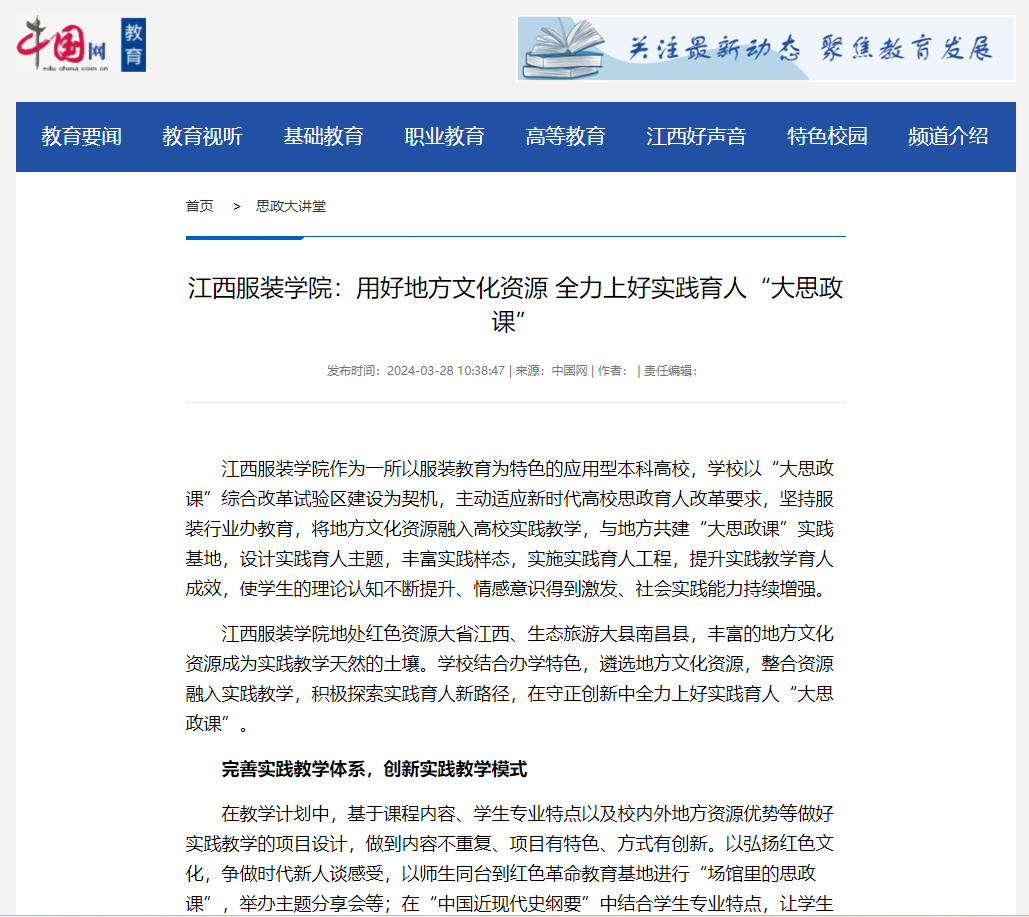 万象城平台作为一所以服装教育为特色的应用型本科高校,学校以“大思政课”综合改革试验区建设为契机,主动适应新时代高校思政育人改革要求,坚持服装行业办教育,将地方文化资源融入高校实践教学,与地方共建“大思政课”实践基地,设计实践育人主题,丰富实践样态,实施实践育人工程,提升实践教学育人成效,使学生的理论认知不断提升、情感意识得到激发、社会实践能力持续增强。
