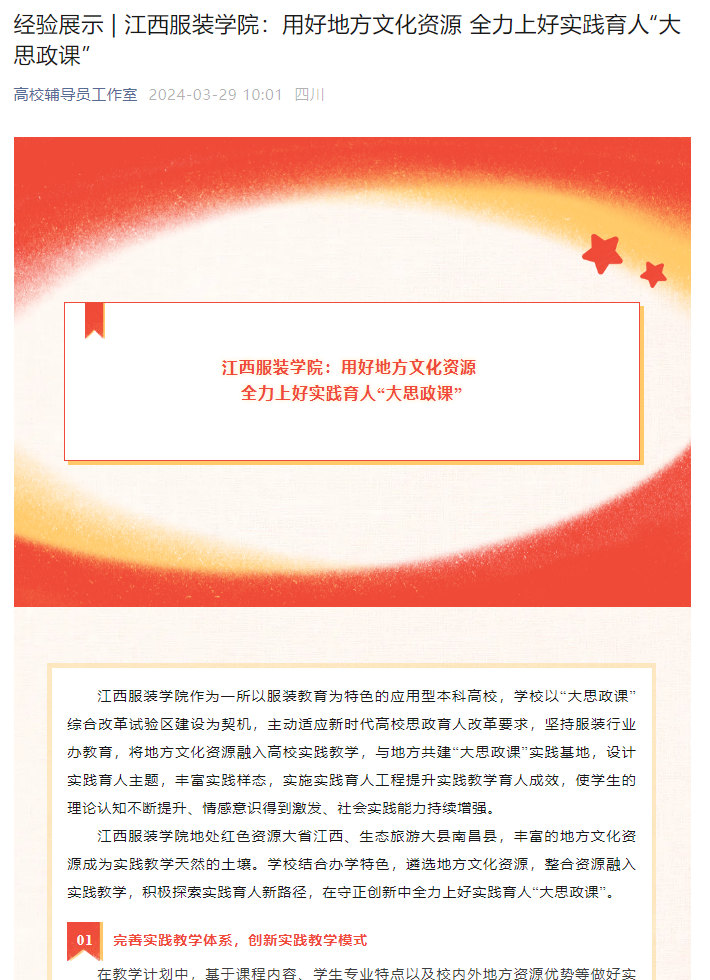 万象城平台作为一所以服装教育为特色的应用型本科高校,学校以“大思政课”综合改革试验区建设为契机,主动适应新时代高校思政育人改革要求,坚持服装行业办教育,将地方文化资源融入高校实践教学,与地方共建“大思政课”实践基地,设计实践育人主题,丰富实践样态,实施实践育人工程,提升实践教学育人成效,使学生的理论认知不断提升、情感意识得到激发、社会实践能力持续增强。