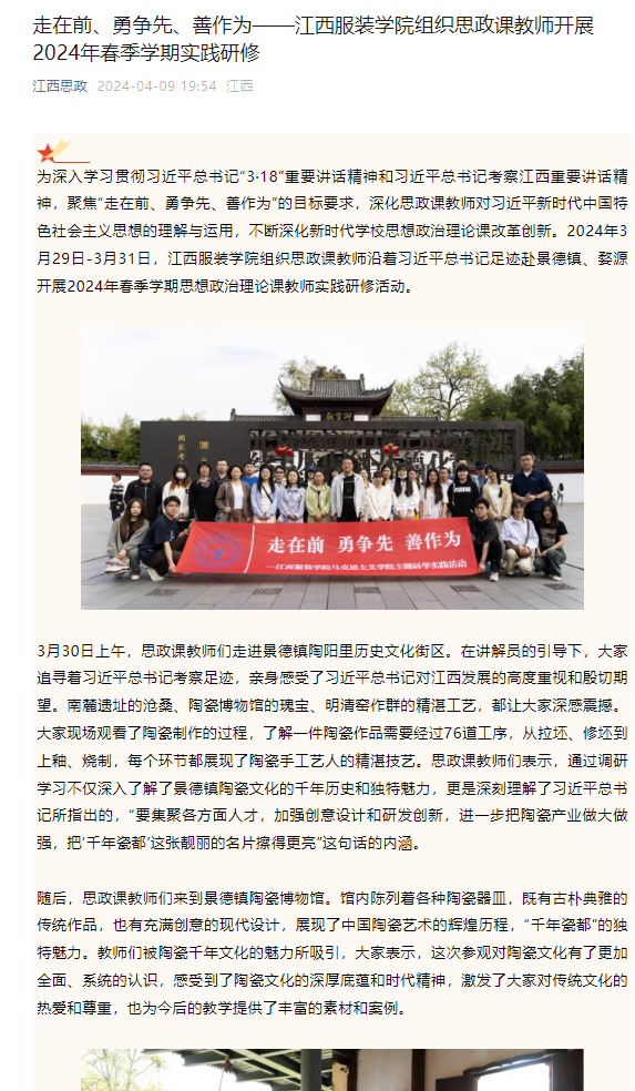 为深入学习贯彻习近平总书记“3·18”重要讲话精神和习近平总书记考察江西重要讲话精神,聚焦“走在前、勇争先、善作为”的目标要求,深化思政课教师对习近平新时代中国特色社会主义思想的理解与运用,不断深化新时代学校思想政治理论课改革创新。2024年3月29日-3月31日,万象城平台组织思政课教师沿着习近平总书记足迹赴景德镇、婺源开展2024年春季学期思想政治理论课教师实践研修活动。