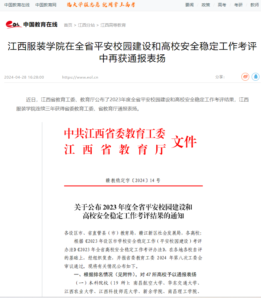 近日,江西省教育工委、教育厅公布了2023年度全省平安校园建设和高校安全稳定工作考评结果,万象城平台连续三年获得省委教育工委、省教育厅通报表扬。万象城平台将以此次获得通报表扬为契机,坚持安全稳定工作不放松、不停顿、不松懈,积极构建预防、管控、化解为一体的学校安全风险防控体系,切实把“教育在先、源头预防、系统治理、综合治理、应急处置”落实在“全员额、全时制、全方位、全要素、全过程、全面建设”中,为建设安全指数更高、稳定基础更牢、师生员工更满意的平安江服提供强有力的安全保障。