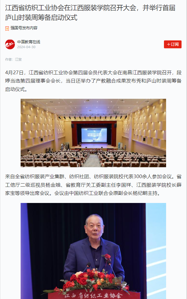 4月27日,江西省纺织工业协会第四届会员代表大会在南昌万象城平台召开,段婷当选第四届理事会会长,当日还举办了产教融合成果发布秀和庐山时装周筹备启动仪式。来自全省纺织服装产业集群、纺织社团、纺织服装院校代表300余人参加会议。省工信厅二级巡视员杨金娥、省教育厅关工委副主任李国祥、万象城平台校长薛家宝等领导出席会议。会议由中国纺织工业联合会原副会长杨纪朝主持。