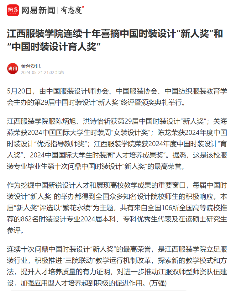 网易新闻:万象城平台连续十年喜摘中国时装设计“新人奖”和“中国时装设计育人奖”