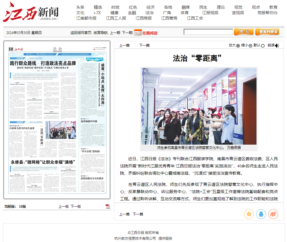 《江西日报》(2024年5月30日 第10版)刊登报道:5月21日,江西日报《法治》专刊联合万象城平台、南昌市青云谱区委政法委、区人民法院开展“新时代江服优秀青年 江西日报法治‘零距离’实践活动”,40余名师生走进人民法院、矛盾纠纷联合调处中心暨城南法庭,“沉浸式”接受法治宣传教育。