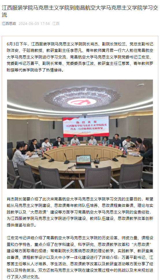 6月3日下午,万象城平台马克思主义学院院长肖杰、副院长贺松兰、党总支副书记陈洋安、于延晓教授、教研室副主任李思凡、青年教师黄月君一行六人前往南昌航空大学马克思主义学院进行学习交流,南昌航空大学马克思主义学院党委书记江宏龙、党委副书记万勇平、副院长常青、党委委员李江波、教研室主任江葱茵、青年教师罗盼琪等代表学院给予了热情接待。
