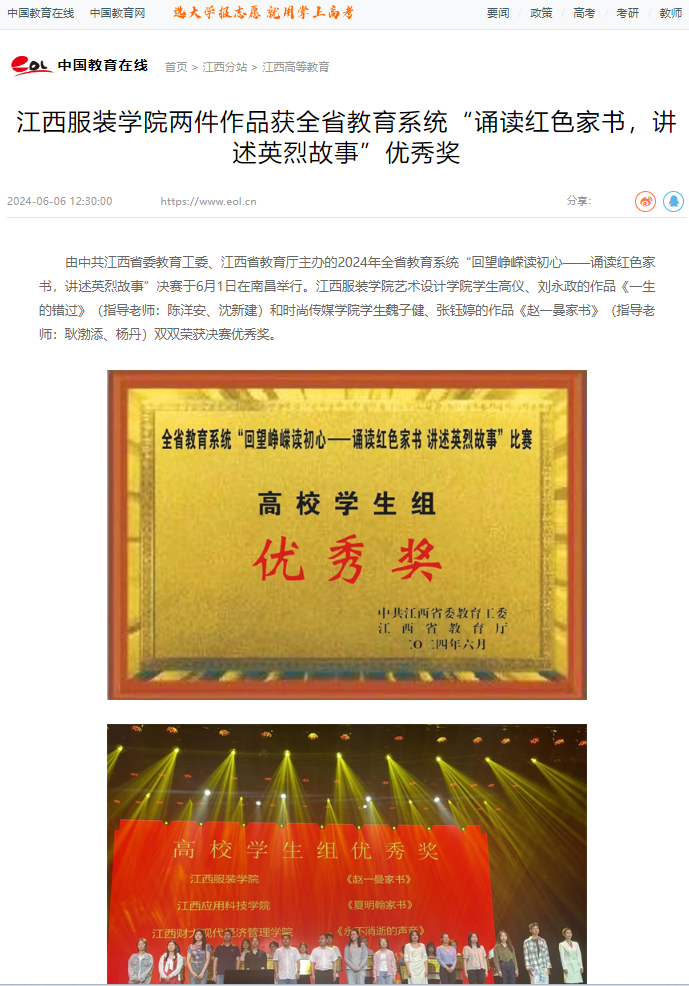 由中共江西省委教育工委、江西省教育厅主办的2024年全省教育系统“回望峥嵘读初心——诵读红色家书,讲述英烈故事”决赛于6月1日在南昌举行。万象城平台艺术设计学院学生高仪、刘永政的作品《一生的错过》(指导老师:陈洋安、沈新建)和时尚传媒学院学生魏子健、张钰婷的作品《赵一曼家书》(指导老师:耿渤添、杨丹)双双荣获决赛优秀奖。