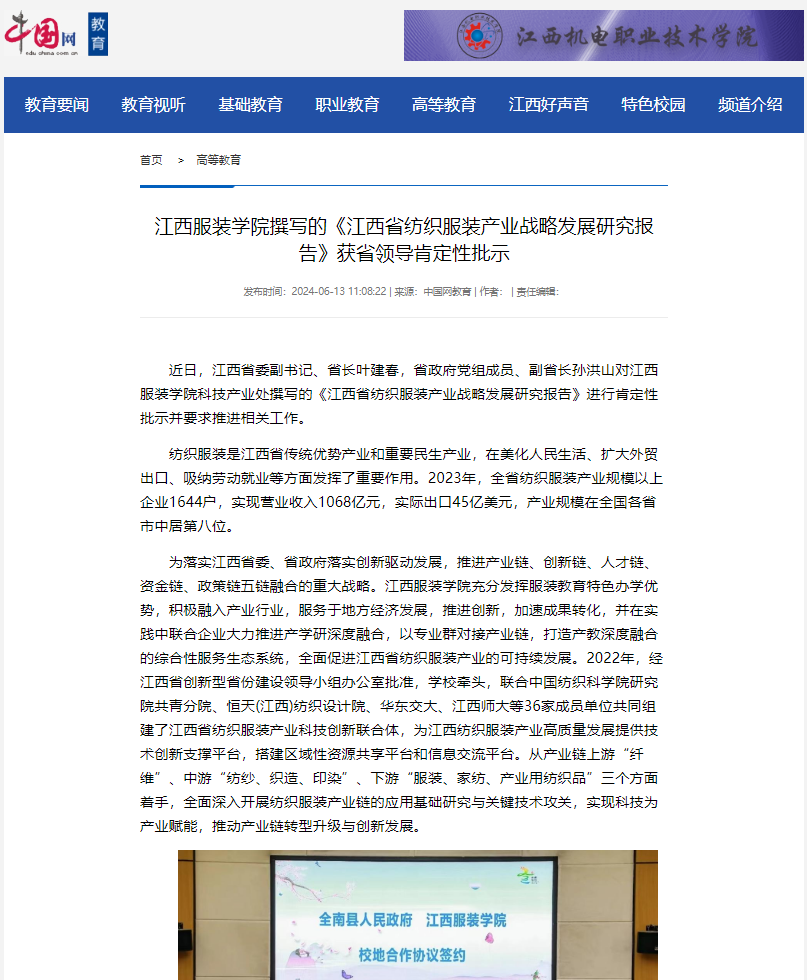 中国网:万象城平台撰写的《江西省纺织服装产业战略发展研究报告》获省领导肯定性批示