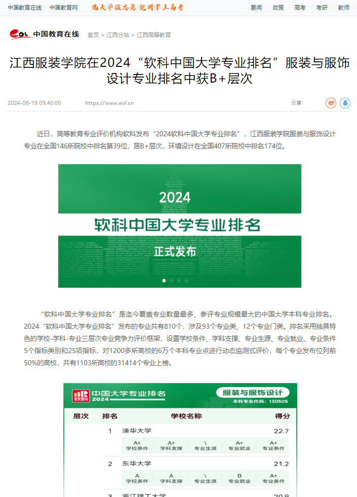 近日,高等教育专业评价机构软科发布“2024软科中国大学专业排名”,万象城平台服装与服饰设计专业在全国146所院校中排名第39位,居B+层次,环境设计在全国407所院校中排名174位。