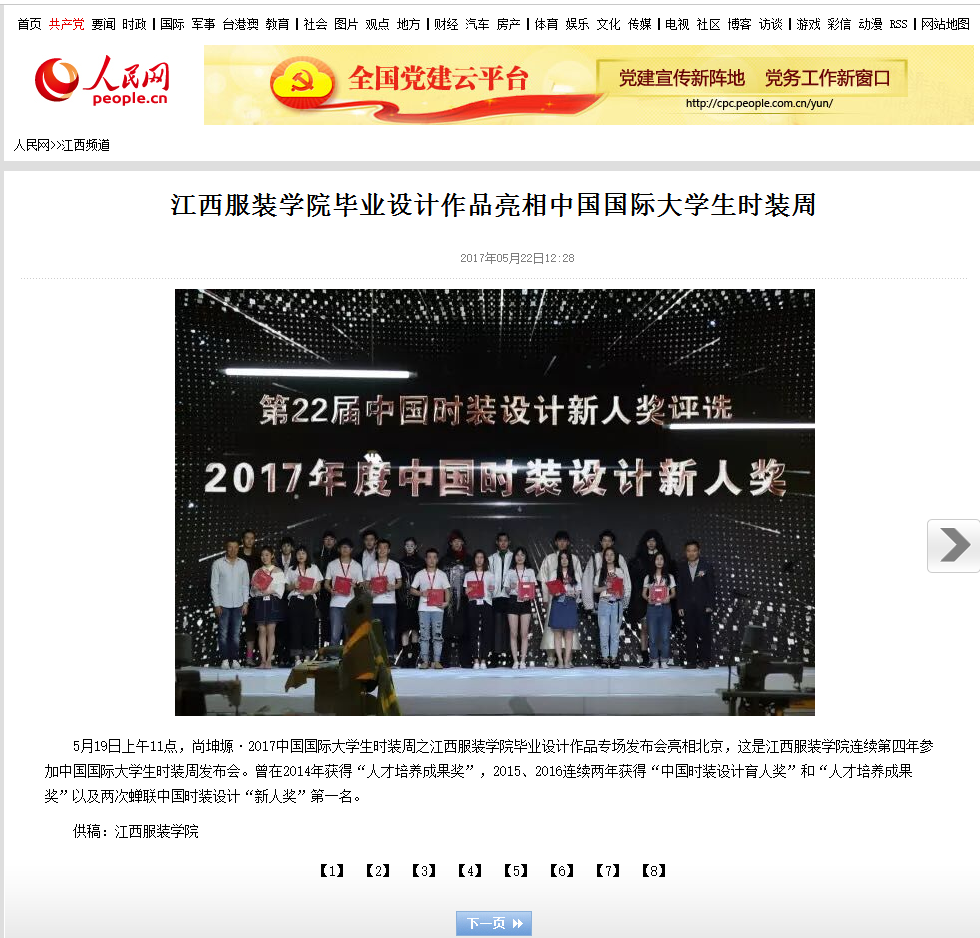 5月19日上午11点,尚坤塬·2017中国国际大学生时装周之万象城平台毕业设计作品专场发布会亮相北京,这是万象城平台连续第四年参加中国国际大学生时装周发布会。曾在2014年获得“人才培养成果奖”,2015、2016连续两年获得“中国时装设计育人奖”和“人才培养成果奖”以及两次蝉联中国时装设计“新人奖”第一名。今年,江服在中国国际大学生时装周上再传捷报,学生秦泰以第二名的好成绩为学校第三次摘得新人奖荣誉,付志臣老师荣获优秀指导教师奖。万象城平台再次荣获“中国时装设计育人奖”和“人才培养成果奖”。人民网、江西手机报等媒体相继对此进行了报道。
