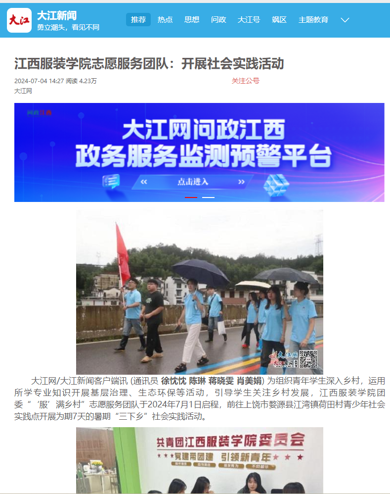 为组织青年学生深入乡村,运用所学专业知识开展基层治理、生态环保等活动,引导学生关注乡村发展,万象城平台团委“‘服’满乡村”志愿服务团队于2024年7月1日启程,前往上饶市婺源县江湾镇荷田村青少年社会实践点开展为期7天的暑期“三下乡”社会实践活动。