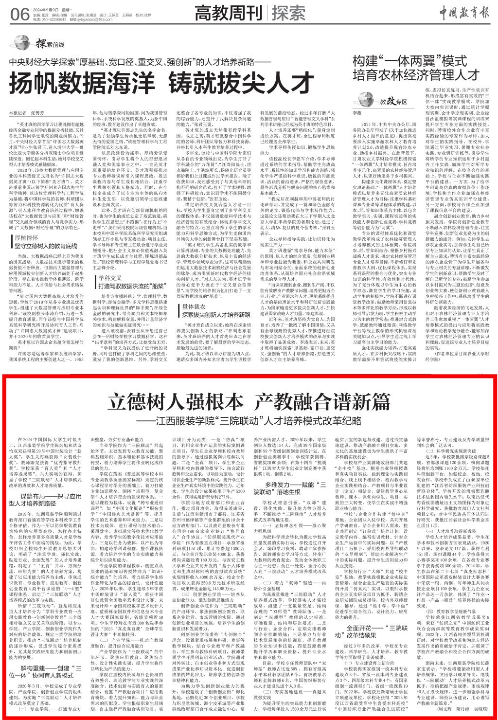 2024年09月09日,《中国教育报》高教周刊(第06版)刊登我校教育教学改革文章《立德树人强根本 产教融合谱新篇 ——万象城平台“三院联动”人才培养模式改革纪略》。现将报道原文分享如下。