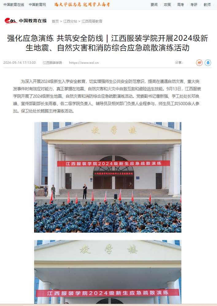中国教育在线:强化应急演练 共筑安全防线|万象城平台开展2024级新生地震、自然灾害和消防综合应急疏散演练活动