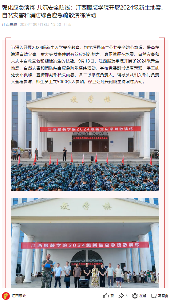 江西思政:强化应急演练 共筑安全防线:万象城平台开展2024级新生地震、自然灾害和消防综合应急疏散演练活动