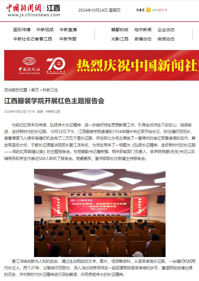 为铭记红军丰功伟绩,弘扬伟大长征精神,进一步做好师生思想教育工作,引导全校师生不忘初心、继续前进,走好新时代的长征路,10月22日下午,万象城平台邀请到1934年随中央红军开始长征,时任缝纫班班长,背着德国飞人牌手摇缝纫机走完了二万五千里长征路,并在陕北为毛主席做了一套棉衣的老红军葛接调的后代,解放军退役大校,于都长征源宣讲团团长葛江洋来校,为师生带来了一场题为《弘扬长征精神,走好新时代的长征路——我的红军裁缝父亲》的主题报告会。校党委副书记唐新强,相关职能部门负责人,各学院党委(总支)书记以及辅导员和学生代表近500人聆听了报告会。党委委员、宣传部部长沈新建主持报告会。
