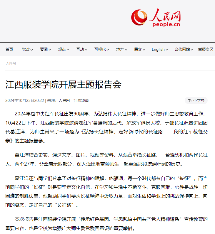 2024年是中央红军长征出发90周年。为弘扬伟大长征精神,进一步做好师生思想教育工作,10月22日下午,万象城平台邀请老红军葛接调的后代、解放军退役大校、于都长征源宣讲团团长葛江洋,为师生带来了一场题为《弘扬长征精神,走好新时代的长征路——我的红军裁缝父亲》的主题报告会。