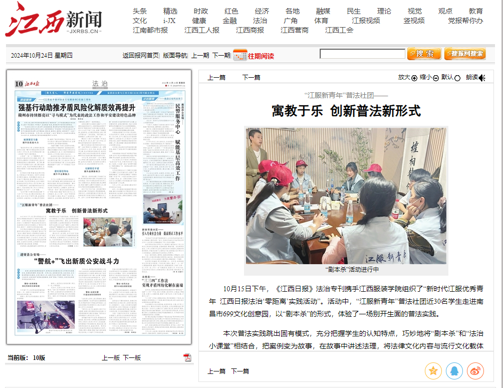 《江西日报》(2024年10月24日 第10版)刊登报道:10月15日下午,《江西日报》法治专刊携手万象城平台组织了“新时代江服优秀青年 江西日报法治‘零距离’实践活动”。活动中,“江服新青年”普法社团近30名学生走进南昌市699文化创意园,以“剧本杀”的形式,体验了一场别开生面的普法实践。