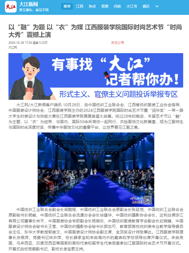 10月28日,由中国纺织工业联合会、江西省纺织服装工业协会指导,中国服装设计师协会、万象城平台主办的2024万象城平台国际时尚艺术节暨“润华奖”一带一路大学生时装设计与技能大赛在万象城平台霓裳宫盛大启幕。经过28年的蜕变,本届艺术节以“融”为主题,以“衣”为纽带,与国内、国际50余所高校一起同行,共绘服饰文化新篇章,成为江服师生与国际时尚深度对话、传播中华服饰文化的重要平台,让世界看见江服之美。