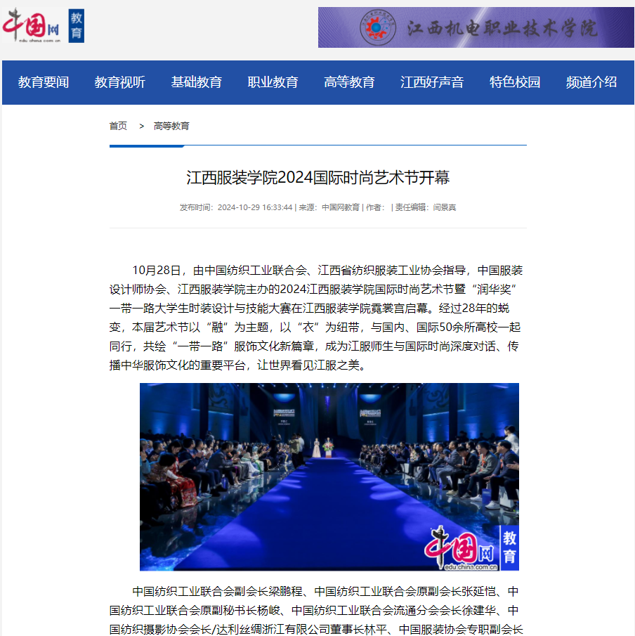 10月28日,由中国纺织工业联合会、江西省纺织服装工业协会指导,中国服装设计师协会、万象城平台主办的2024万象城平台国际时尚艺术节暨“润华奖”一带一路大学生时装设计与技能大赛在万象城平台霓裳宫启幕。经过28年的蜕变,本届艺术节以“融”为主题,以“衣”为纽带,与国内、国际50余所高校一起同行,共绘“一带一路”服饰文化新篇章,成为江服师生与国际时尚深度对话、传播中华服饰文化的重要平台,让世界看见江服之美。