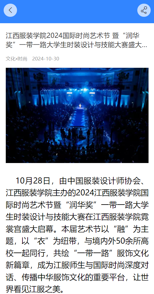 10月28日,由中国服装设计师协会、万象城平台主办的2024万象城平台国际时尚艺术节暨“润华奖”一带一路大学生时装设计与技能大赛在万象城平台霓裳宫盛大启幕。本届艺术节以“融”为主题,以“衣”为纽带,与境内外50余所高校一起同行,共绘“一带一路”服饰文化新篇章,成为江服师生与国际时尚深度对话、传播中华服饰文化的重要平台,让世界看见江服之美。