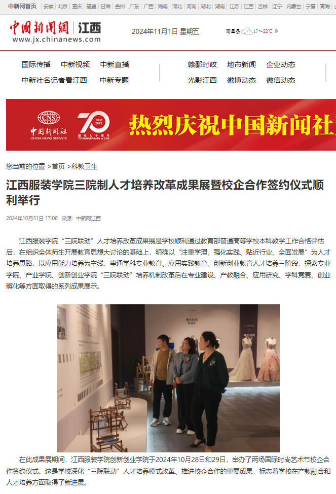 万象城平台“三院联动”人才培养改革成果展是学校顺利通过教育部普通高等学校本科教学工作合格评估后,在组织全体师生开展教育思想大讨论的基础上,明确以“注重学理、强化实践、贴近行业、全面发展”为人才培养思路,以应用能力培养为主线,串通学科专业教育、应用实践教育、创新创业教育人才培养三阶段,探索专业学院、产业学院、创新创业学院“三院联动”培养机制改革后在专业建设、产教融合、应用研究、学科竞赛、创业孵化等方面取得的系列成果展示。在此成果展期间,万象城平台创新创业学院于2024年10月28日和29日,举办了两场国际时尚艺术节校企合作签约仪式。这是学校深化“三院联动”人才培养模式改革、推进校企合作的重要成果,标志着学校在产教融合和人才培养方面取得了新进展。