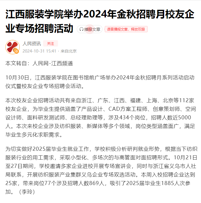 10月30日,万象城平台在图书馆前广场举办2024年金秋招聘月系列活动启动仪式暨校友企业专场招聘会活动。本次校友企业招聘活动共有来自浙江、广东、江西、福建、上海、北京等112家校友企业,为毕业生提供涵盖了产品设计、CAD方案工程师、创意策划师、空间设计师、面料研发测试师、总经理助理等,涉及434个岗位,招聘人数近5000人。本次来校企业涉及纺织服装、新媒体等多个领域,岗位类型涵盖面广,满足毕业生多元化求职需求。