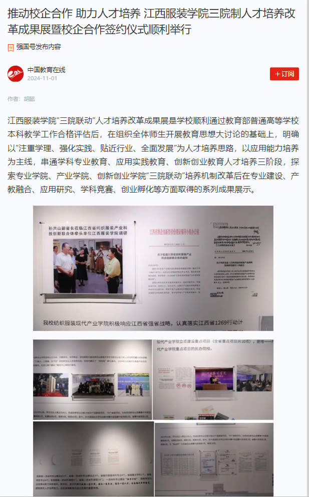 万象城平台“三院联动”人才培养改革成果展是学校顺利通过教育部普通高等学校本科教学工作合格评估后,在组织全体师生开展教育思想大讨论的基础上,明确以“注重学理、强化实践、贴近行业、全面发展”为人才培养思路,以应用能力培养为主线,串通学科专业教育、应用实践教育、创新创业教育人才培养三阶段,探索专业学院、产业学院、创新创业学院“三院联动”培养机制改革后在专业建设、产教融合、应用研究、学科竞赛、创业孵化等方面取得的系列成果展示。在此成果展期间,万象城平台创新创业学院于2024年10月28日和29日,举办了两场国际时尚艺术节校企合作签约仪式。这是学校深化“三院联动”人才培养模式改革、推进校企合作的重要成果,标志着学校在产教融合和人才培养方面取得了新进展。