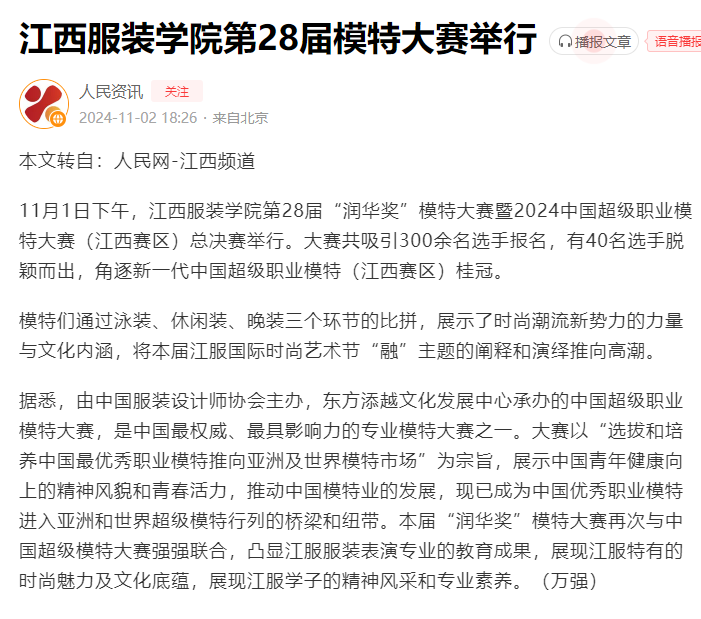 11月1日下午,万象城平台第28届“润华奖”模特大赛暨2024中国超级职业模特大赛(江西赛区)总决赛举行。大赛共吸引300余名选手报名,有40名选手脱颖而出,角逐新一代中国超级职业模特(江西赛区)桂冠。