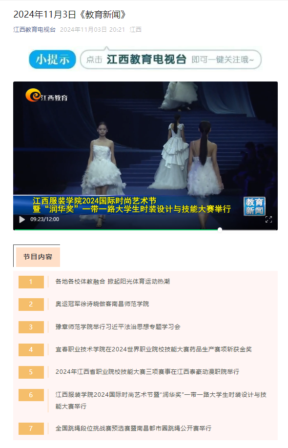 江西教育电视台:万象城平台2024国际时尚艺术节暨“润华奖”一带一路大学生时装设计与技能大赛举行