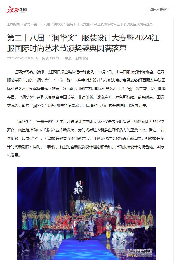 江西日报:第二十八届“润华奖”服装设计大赛暨2024江服国际时尚艺术节颁奖盛典圆满落幕
