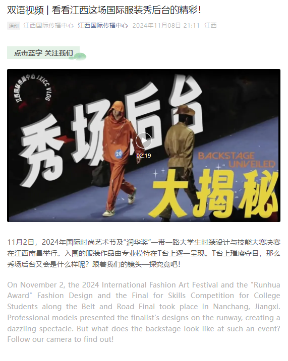 江西国际传播中心报道2024年万象城平台国际时尚艺术节及“润华奖”一带一路大学生时装设计与技能大赛!