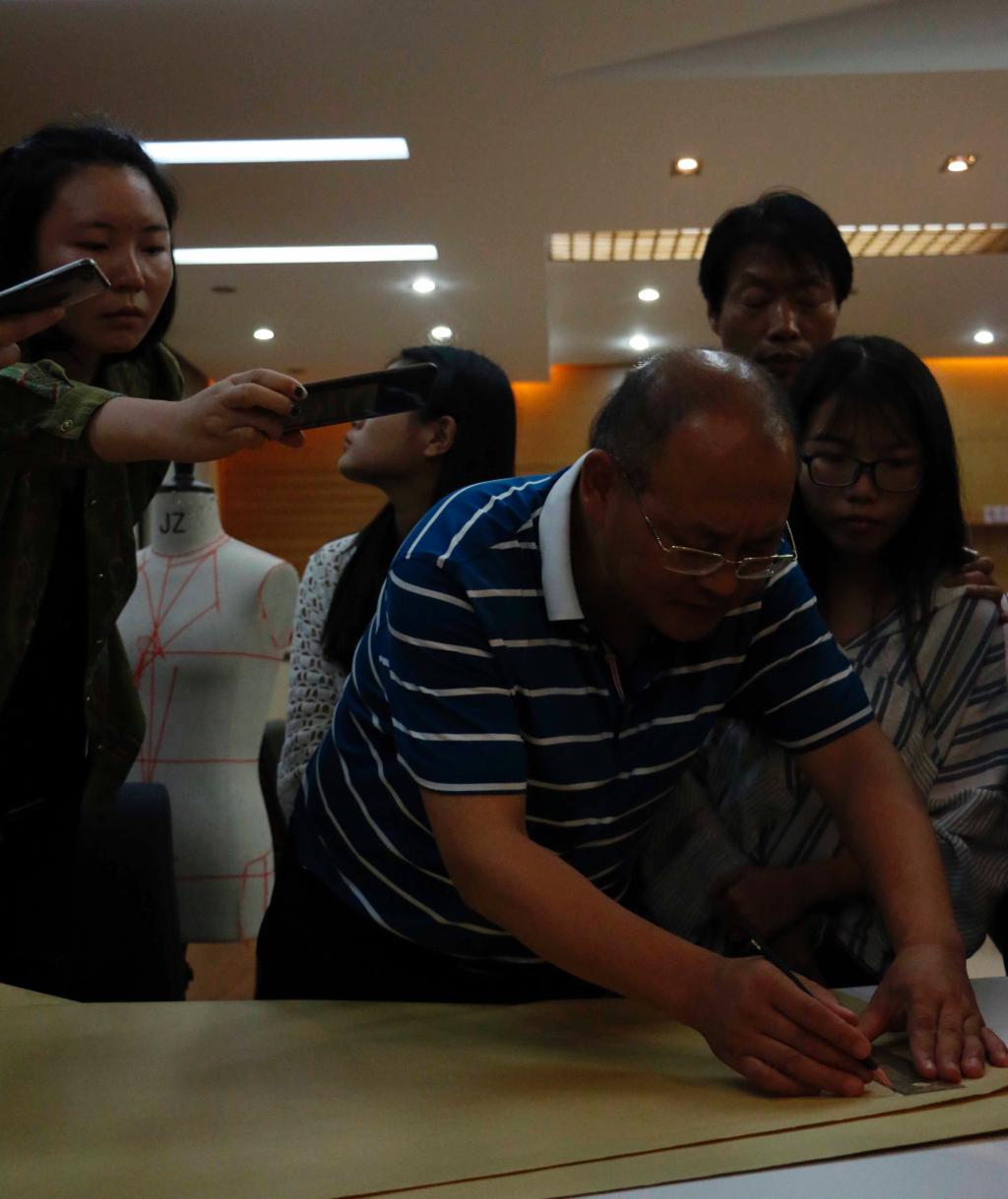 讲座在朱教授的现场演示中达到报告的高潮,特别是朱教授现场十几分钟画好图纸并制版,为学生量身定做了样式洒脱的西服,令所有的老师和学生感到震撼,赢得现场阵阵掌声。