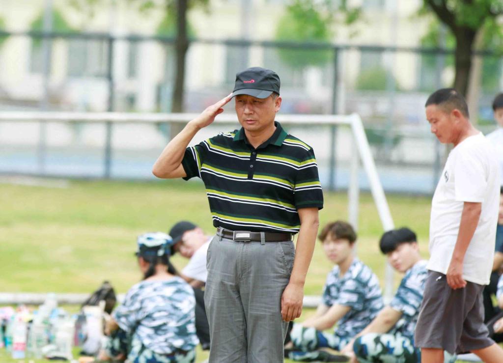 军训的每一天校领导都会来到田径场上查看新生训练情况,图为高建国副书记向带训的教官们致敬。