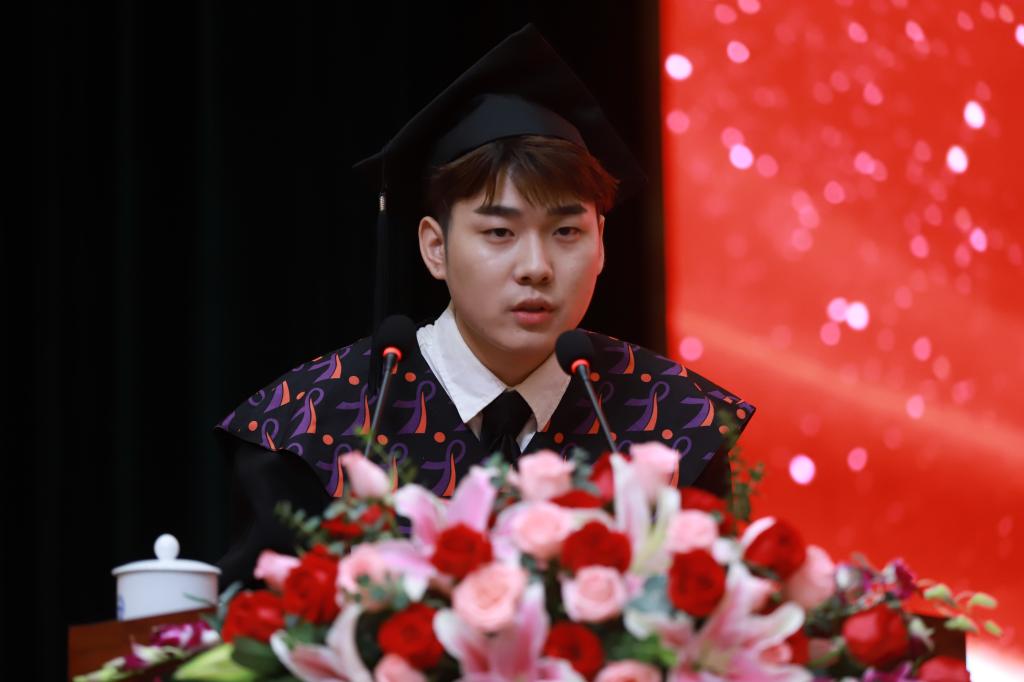 服装设计学院2023届时装设计专业党行行同学作为毕业生代表发言,回顾了自己在江服求学生活的感悟和收获,表达了对学校、老师的感激和对校园生活的留恋,并表示将不负时代,不负韶华,在青春的赛道上奋力奔跑,跑出当代青年的最好成绩!