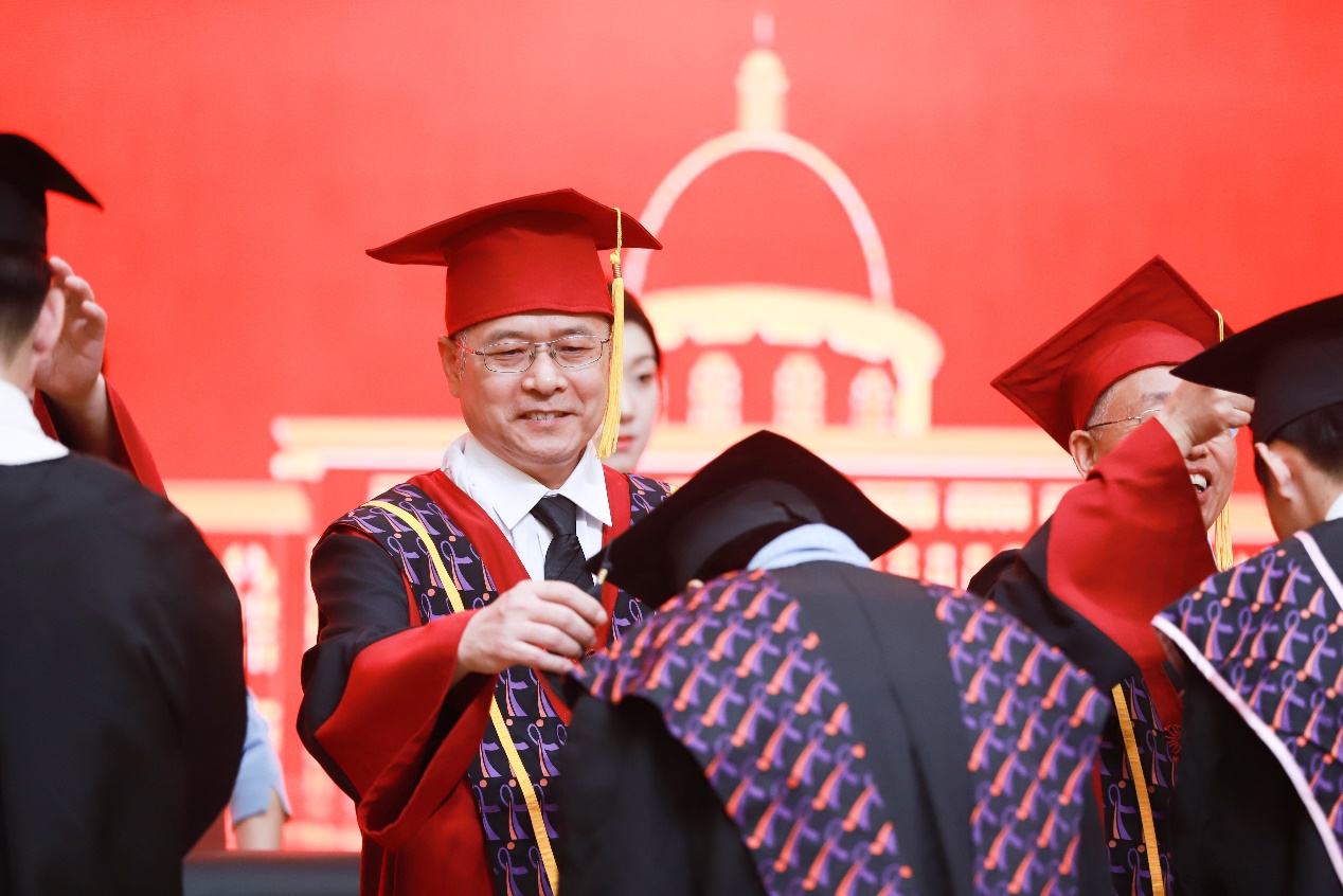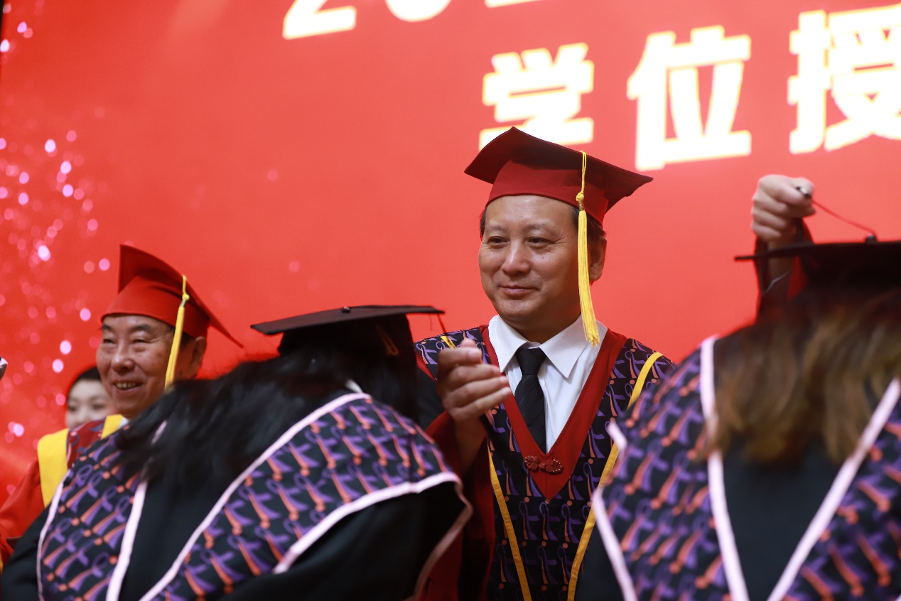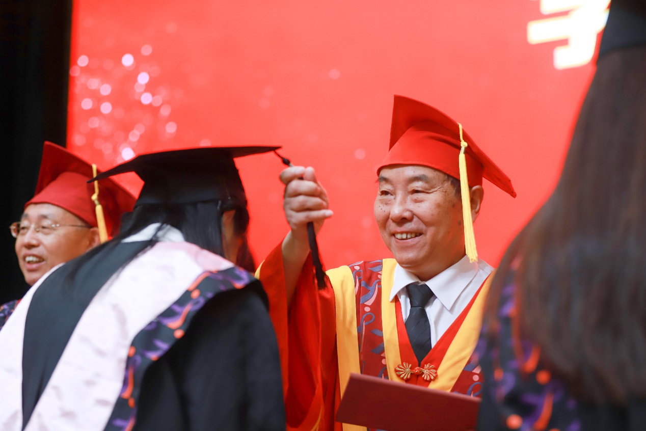 在教师、家长、校友的共同见证下,薛家宝、李宝君、陈东生、刘孜杰、唐新强、李沛武、周文辉、闵悦等为毕业生代表一一拨动帽穗、颁发学位证书,并与他们合影留念。毕业生们向在座的师长鞠躬致谢,与同学拥抱惜别,典礼现场洋溢着浓浓的温暖与感动。