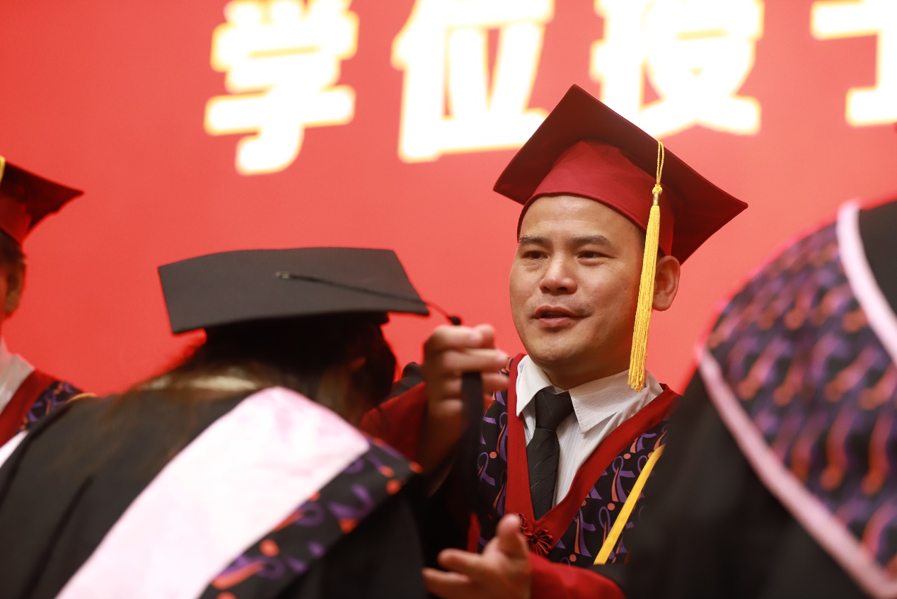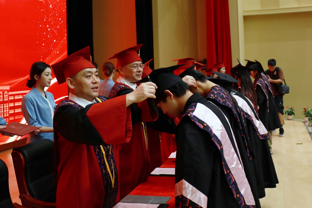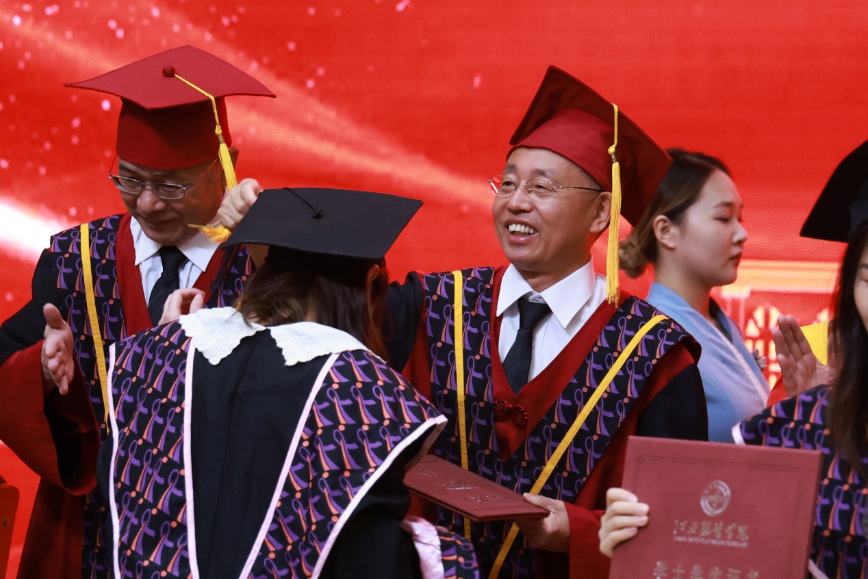 在教师、家长、校友的共同见证下,薛家宝、李宝君、陈东生、刘孜杰、唐新强、李沛武、周文辉、闵悦等为毕业生代表一一拨动帽穗、颁发学位证书,并与他们合影留念。毕业生们向在座的师长鞠躬致谢,与同学拥抱惜别,典礼现场洋溢着浓浓的温暖与感动。