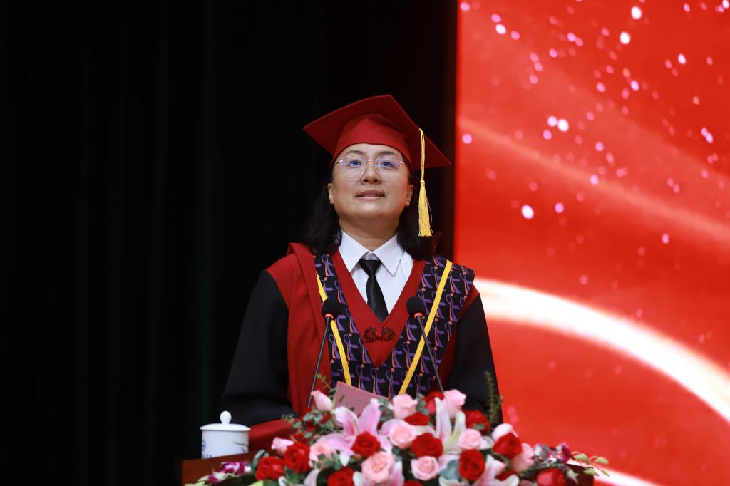 艺术设计学院院长刘琳代表学校全体教师为2023届全体毕业生送上真诚祝福。她勉励全体毕业生要永远保持善良与真诚,做有温度的青年;永远保持对世界的探索与好奇心,做有活力的青年;永远记住要注重身心健康,做有责任的青年。
