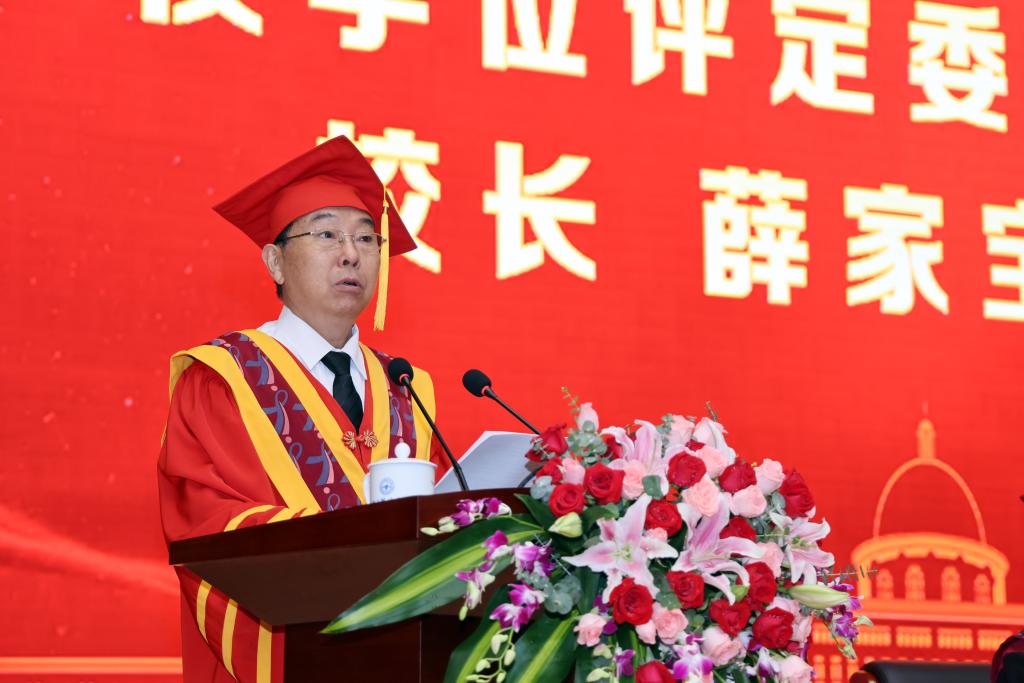 校长薛家宝在讲话中代表学校理事会、校党委和校行政,向现场和“云端”的顺利完成学业、即将开启人生新航程的4797名毕业生表示最热烈的祝贺和最美好的祝愿,向默默耕耘、无私奉献的老师们表示最衷心的感谢和最崇高的敬意,向为你们成长成才含辛茹苦、辛勤劳作的家长们表示最亲切的问候和最真挚的祝福!薛家宝深情回忆了过去几年来同学们在“勤信博雅”校训的熏陶下,挥洒汗水、激扬青春、勤奋学习、积极进取的难忘时光,为同学们的成长与收获感到骄傲,并在临别之际向即将开启新的人生航程的毕业生们深情寄语: