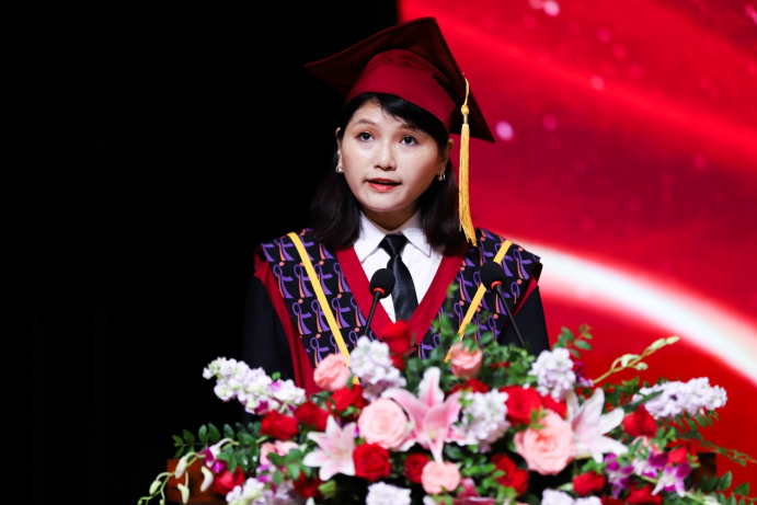 毕业生代表、服装工程学院2020级服智本科1班陈千珠发言分享了自己在万象城平台求学过程中的所思所得,着重感谢了母校对于自己的悉心教诲与精心栽培。她说,今天我们是江服的学生,明天我们是江服的校友,但无论走到哪里,我们都是江服人!