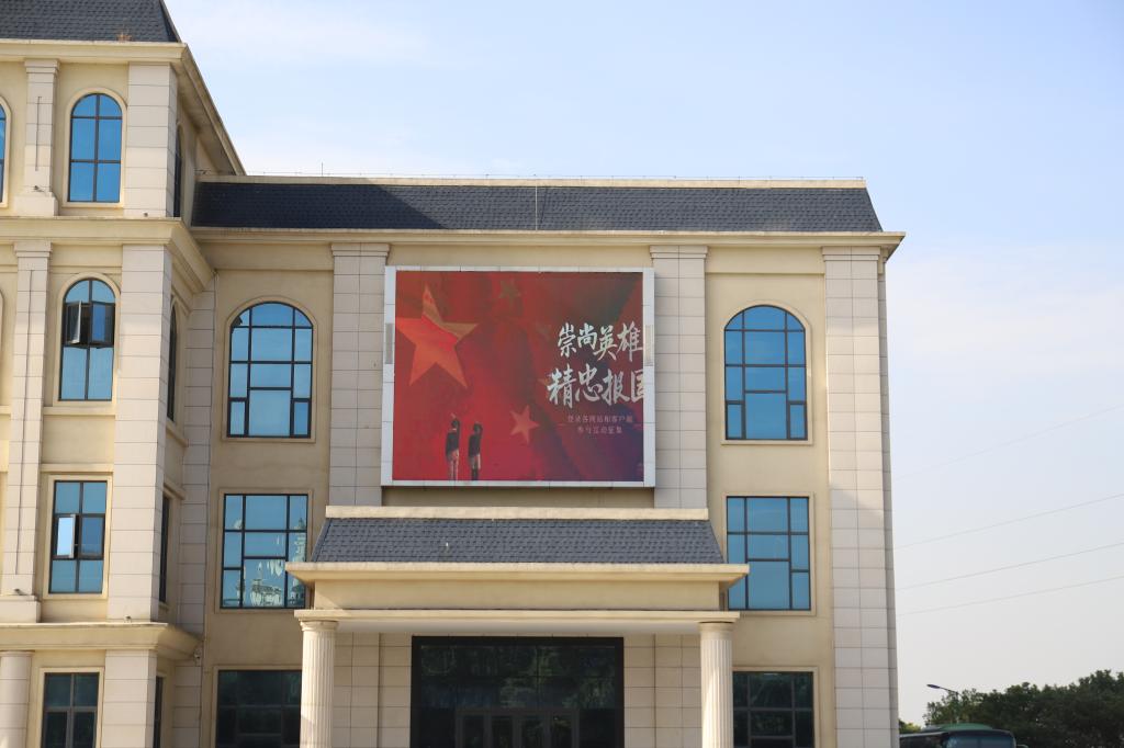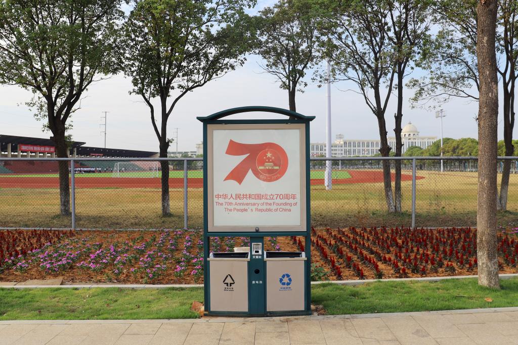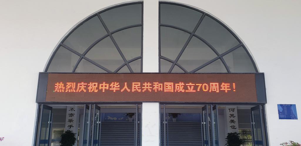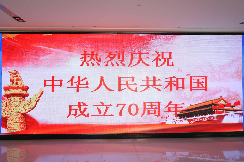 主教学楼、艺术楼、思贤楼等各处电子显示屏推出“热烈庆祝中华人民共和国成立70周年!”“万紫千红迎国庆片片红叶舞秋风”等标语滚动播放;图书馆广场和行政楼大厅的LED大屏幕循环播放红色歌曲MV,引得师生纷纷驻足观看;