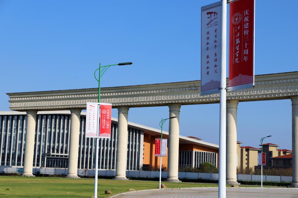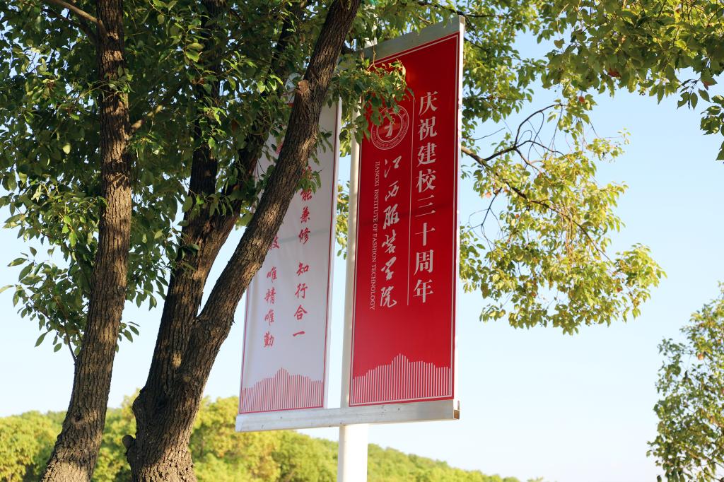 随风飘舞的不仅仅有醉人的桂花香,也有一抹抹喜庆的红色。党委宣传部在校园主干道等多个显著位置摆放了突出校庆主题的各种造型,一张张展板,记录了江服的荣耀,展现了江服人努力成长的印记。道路两旁迎风招展道旗上记载着江服校风、学风,时刻提醒学子们不忘江服精神。