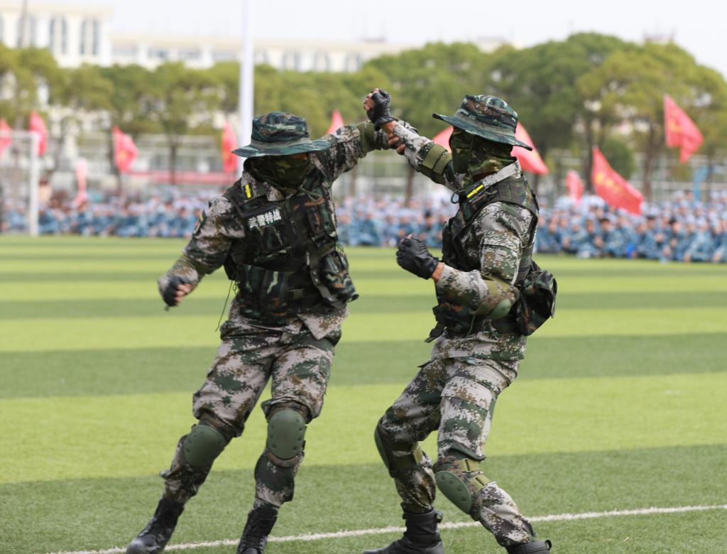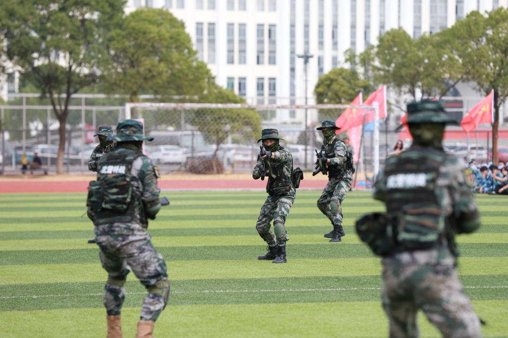 军训教官现场为大家带来了精彩的队列示范、军体拳和擒敌拳表演,齐整的步伐,矫健的身姿展示了军人的风采,为同学们树立了优秀的榜样,赢得在场师生的热烈掌声。